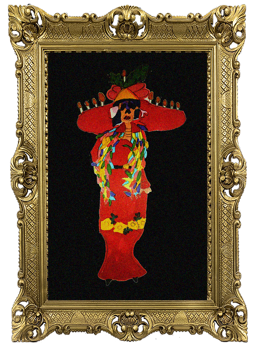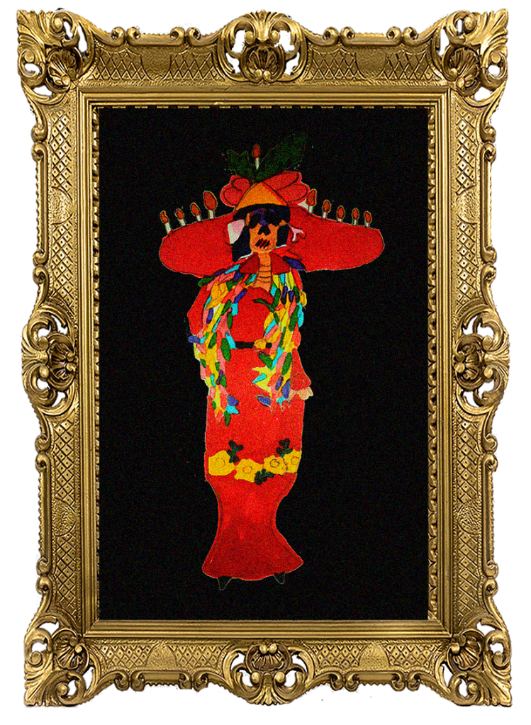 Se le representa como un esqueleto femenino, con sombrero y boa de plumas.